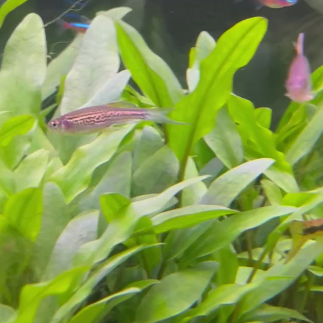 This is a popular captively bred variant of the zebra danio. Leopard danios, characterised by their golden bodies adorned with blue-gray spots, exhibit a scale pattern reminiscent of leopard spots. These robust danios are well-suited for novice fish keepers, as they demonstrate excellent social compatibility with other non-aggressive fish species. They are best kept in schools of 5 or more fish.