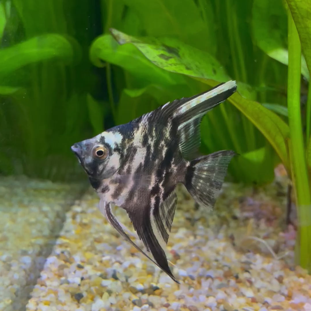Angelfish originate in the Amazon Basin and other rivers throughout South America, and have become popular in aquariums the world over. They are a laterally flat fish, with tall triangular dorsal and anal fins which give Angelfish their distinctive shape. Marble Angelfish have a marbled combination of black and white scales, with variation between specimens in terms of whether the lighter or darker scales dominate the pattern.
