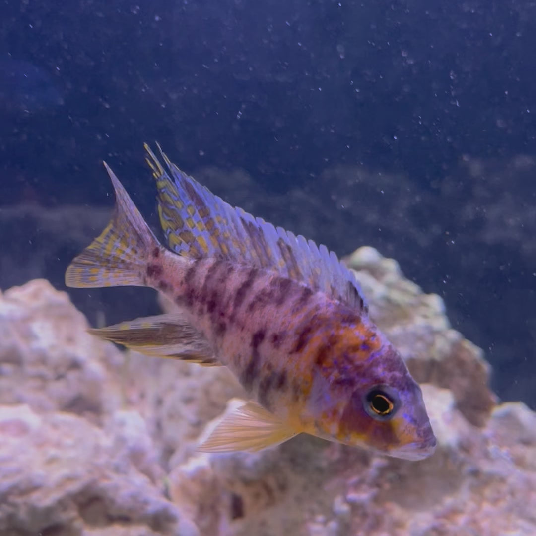 These cichlids are a hybrid species. They are fairly mild mannered and related to Lake Malawi Cichlids. Each fish has a unique pattern and colouration. They mostly will coexist with other Peacocks and Haplochromis. Dominant males may be territorial.